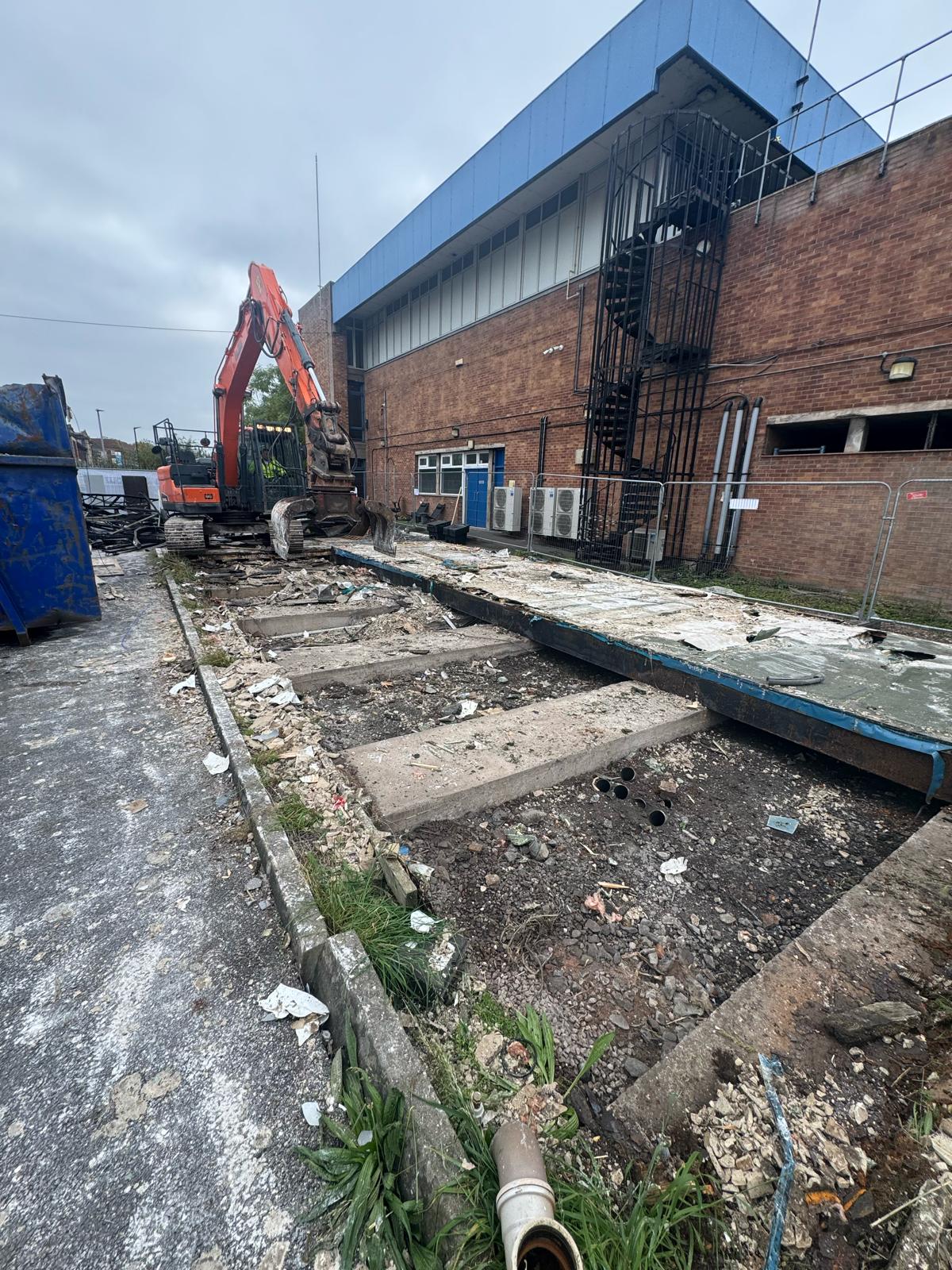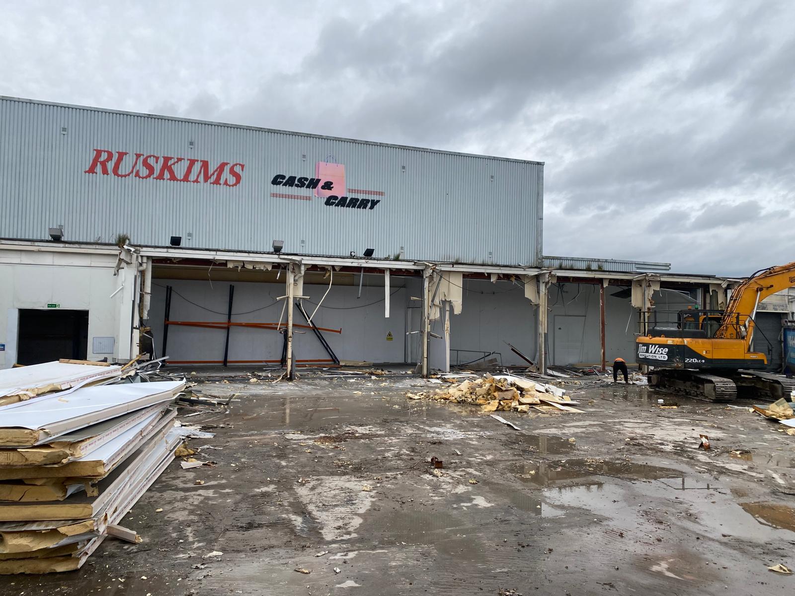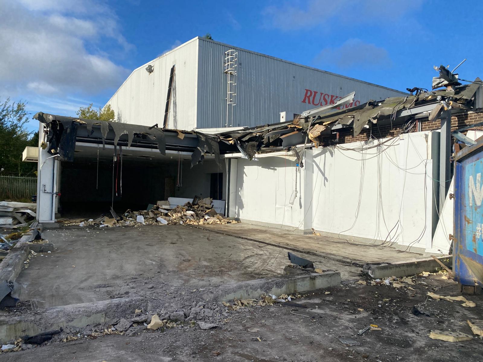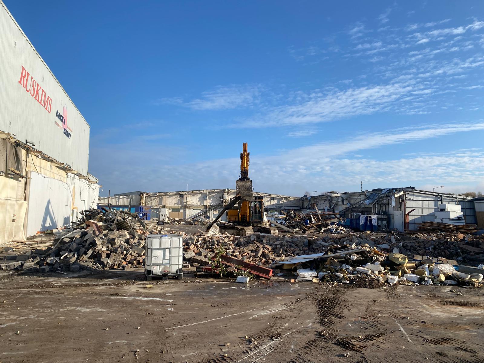 Jim Wise Demolition was appointed to carry out the full demolition and site clearance of the former Ruskims Cash & Carry in Newcastle Upon Tyne. The busy urban location required careful management of traffic, dust and noise throughout the programme. Asbestos survey and licensed removal was completed prior to demolition, with all concrete arisings processed through on-site mobile crushing plant.